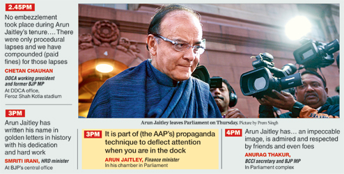 New Delhi, Dec. 17: Arun Jaitley today said the allegations against him were "part of propaganda technique to deflect attention when you yourself are in the dock" - and proceeded to ensure that he remained the focal point through the day.