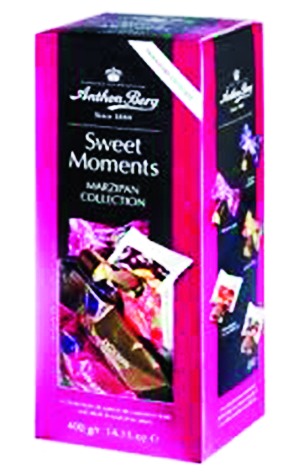 The note lists Anthon Berg Sweet Moments Marzipan Collection 400g, Anthon Berg Sweet Moments Marzipan Bar Mini 165g, Anthon Berg Marcipanbrod Cognac 40g, and Anthon Berg Marcipanbrod Whiskey 40g, and specifies their barcodes and product codes.