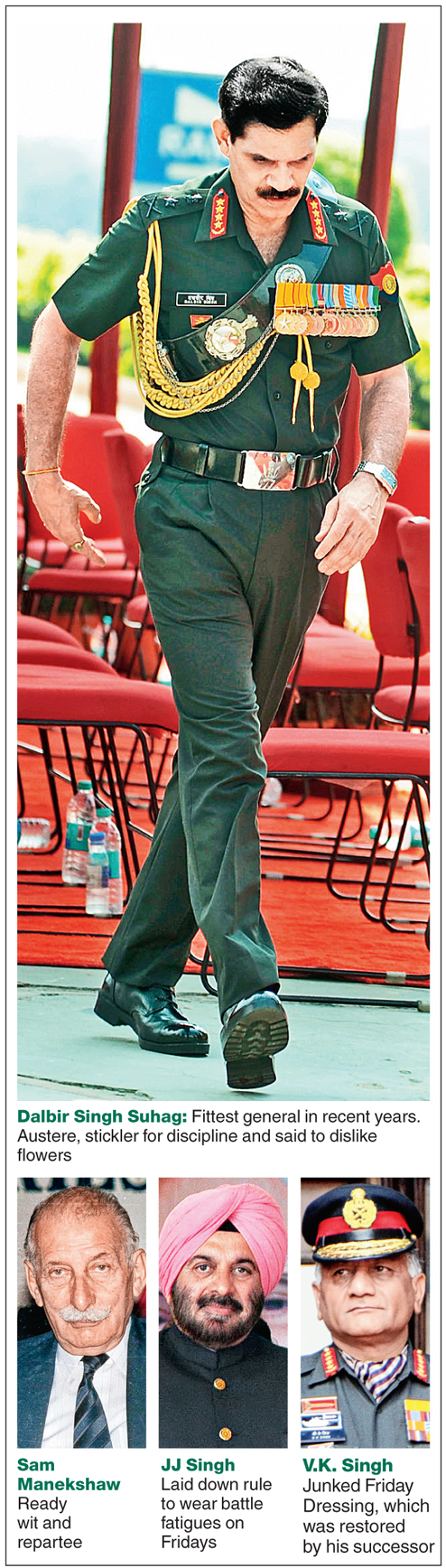 India's chiefs of army staff have often brought into their jobs personal whims that have been issued as commands to the soldiery. Gen. J.J. Singh, who went on to become governor of Arunachal Pradesh after retiring, famously introduced "Friday Dressing" - ordering all in headquarters in New Delhi to wear battle fatigues on Fridays to express empathy with soldiers on the frontlines.