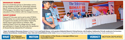 The motion of The Telegraph Bihar Debate 2015 - In the Opinion of the House, A Resurgent Bihar is an Impossible Dream - was defeated with almost negligible opposition. Live examples of Bihar's resurgence were Dhananjay and Sanjit - the students of Anand Kumar of Super 30 fame. The duo made it to the IITs fighting all the odds.