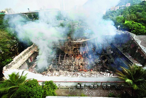 Picture shows smoke rising from the burnt out RK Studios. (PTI)