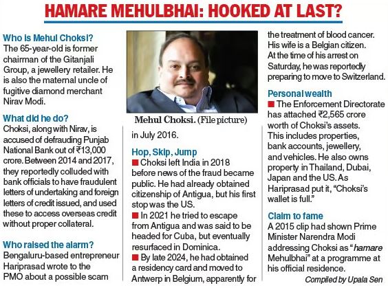 The Opposition had accused the Modi government of “allowing” Choksi and his nephew and co-accused Nirav Modi — who had featured in a group photo with the Prime Minister — to flee Indian law.