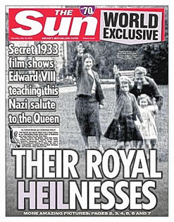 The paper has run a front-page story with an 82-year-old photograph of Queen Elizabeth II and her late mother giving a Nazi salute. Also in the photograph is the then Prince of Wales, Edward, the future King Edward VIII.