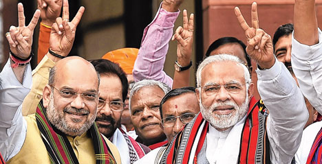 The BJP had begun the day in celebratory mood. As soon as the Prime Minister arrived, the waiting contingent of Shah, ministers and MPs had presented him with traditional scarves of the Northeast and flashed victory signs.