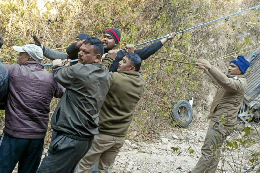 A rescue team attempts to pull the damaged bus which fell-off a deep gorge, in Almora district, Uttarakhand, Tuesday, Dec. 30, 2025. (PTI)