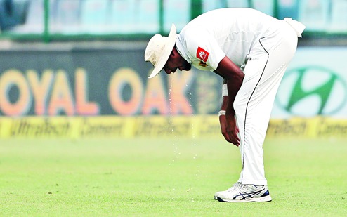 During the Indian innings, Sri Lankan fast bowler Lakmal vomited while fielding. He left the field briefly, only to come back within a few minutes and resume bowling.