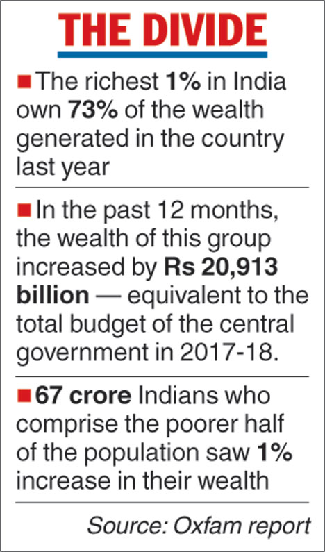 New Delhi: Those who inhabit the top 1 per cent of the wealth pyramid in India own 73 per cent of the wealth generated in the country last year, an NGO has claimed.