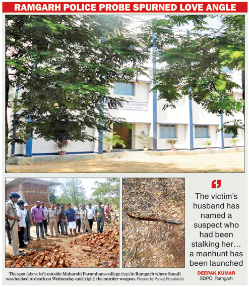 Hazaribagh, May 4: A BEd student was hacked to death with a sickle in front of her college in Ramgarh around noon today, with police suspecting unrequited love to be the trigger behind the vengeful attack, which is grimly reminiscent of a campus murder in Ranchi five years ago.