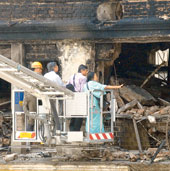| A forensic team inspects the ravaged portions of Stephen Court on Wednesday. (Amit Datta) |