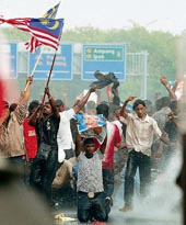 | Malaysian Tamils being sprayed with water cannons during Sunday’s protest in Kuala Lumpur |