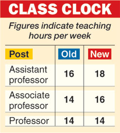 According to the new guidelines notified earlier this month, an assistant professor is expected to teach 18 hours a week, two hours more than the 16-hour rule that was in place.