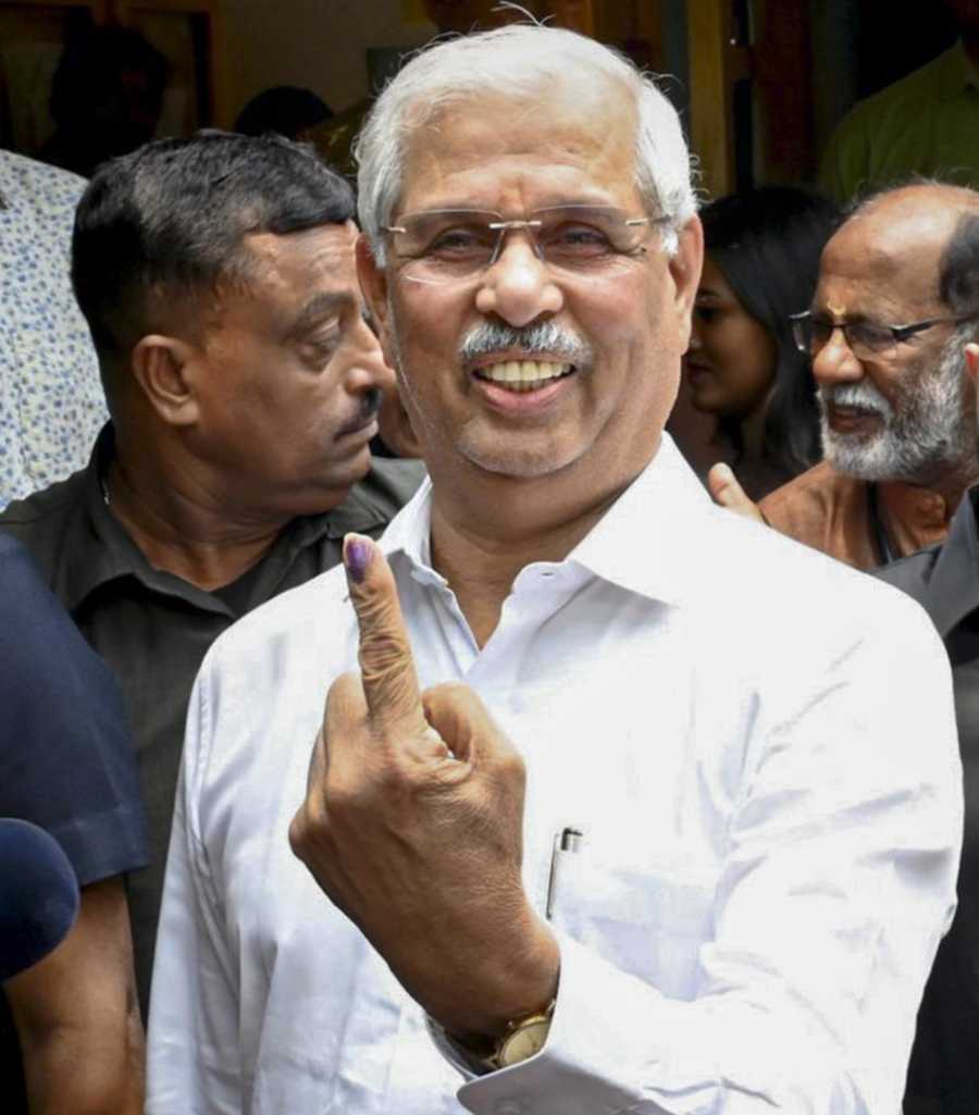 Kerala Governor Rajendra Vishwanath Arlekar shows his ink-marked finger after casting vote during the state Assembly elections, in Thiruvananthapuram. (PTI)