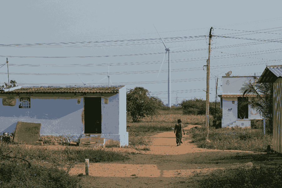 Wind turbines in a village near Kayathar, India, April 8, 2025. India’s creaking electrical grid is lagging behind its push for renewable sources — just as its growing economy hungers for oil stranded by war. (Saumya Khandelwal/The New York Times)