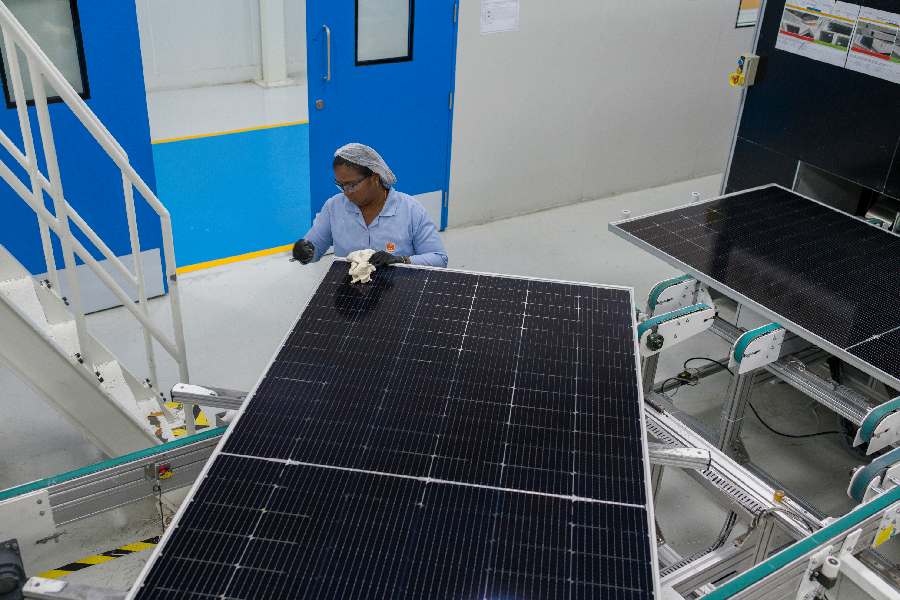 A worker at a solar module factory in Gangaikondan, India, April 9, 2025. (Saumya Khandelwal/The New York Times)