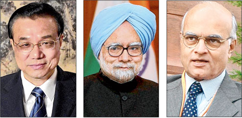 | (From left) Li Keqiang, Manmohan Singh and Shivshankar Menon |