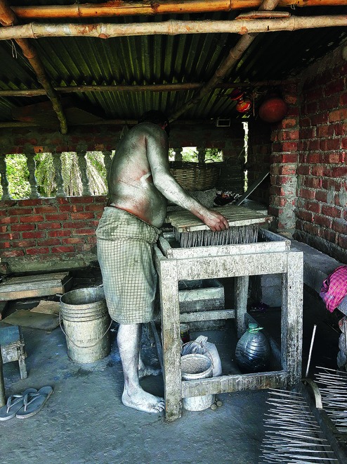 A few houses down the road, Gautam Adhikari is making sparklers on his terrace. There's one large raised platform with a mould fitted on top of it. It is filled with more of that silvery mashla everyone seems to be bathed in. On the floor are these contraptions that resemble beds of nails, the kind you associate with fakir lore. These are actually trays fitted with metal filaments.