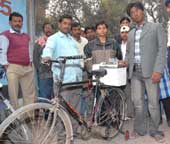 The duo today carried out a demonstration by running a bicycle with the engine. Though the mechanic who ran it seemed tad afraid of its speed at first, later he managed an effective demonstration.