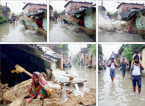 Little before noon on Friday, Tara Devi had a close shave when a portion of her semi-pucca, two-room house collapsed amid heavy waterlogging.