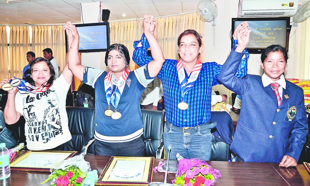 In all, seven police personnel were felicitated on Monday, four of them women - sub-inspector Hansda (archer), inspector Aruna Mishra (pugilist) and constable Bela Ghosh and inspector Sujata Bhagat (both power lifters).