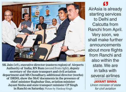 The tripartite agreement was signed between deputy secretary of the state transport and civil aviation department R.N. Ram, AAI executive director (eastern region) S.K. Jain and DRDO additional director (works) M.S. Choudhary in the presence of Union minister of state for civil aviation Jayant Sinha, chief minister Raghubar Das, state urban development minister C.P. Singh, MPs Ram Tahal Choudhary (Ranchi), Nishikant Dubey (Godda).