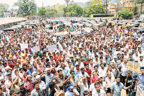 On Monday, the protest swelled thrice the size as over 1,500 auto rickshaw drivers held a massive demonstration in front of the district collectorate. The agitation, held under the banner of Sikshit Berojgar Tempo Chalak evam Sanchalak Sangh, was led by Jamshedpur (West) MLA and Congressman Banna Gupta.