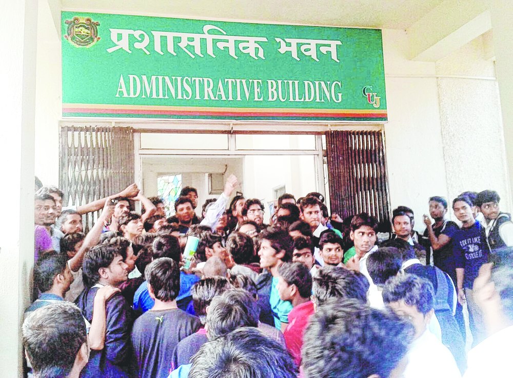 Sensing trouble, CUJ authorities locked the gate of administrative building.
