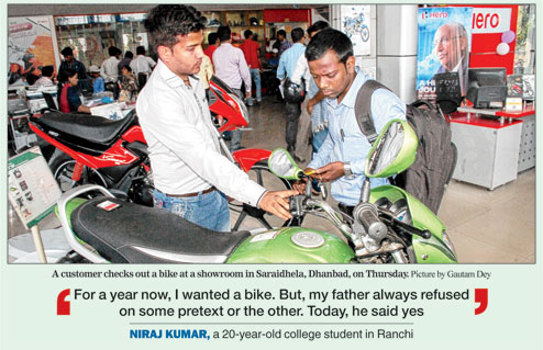 In Dhanbad, Guru Kripa Auto, an authorised Hero bike dealer, said 700 two-wheelers out of their stock of 1,300 had been booked on Thursday. "We are offering discounts ranging from Rs 7,000 to 14,000. Insurance is also being sold cheap," said proprietor Sharad Dudani.