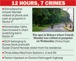 At a marathon meeting on Sunday, district police chief Y.S. Ramesh had read out the riot act to his juniors, asking them to perform or perish. The stinging censure came in the wake of 96 cases of snatchings, robberies and burglaries in Bokaro in the past two months. But, action on the ground has been zero if the spate of crimes in the past 12 hours are taken into account.