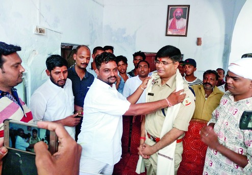 President of Ramnavami Mahasamiti Piku Yadav felicitates Hazaribagh SP Anoop Birtharay on Sunday. Picture by Vishvendu Jaipuriar