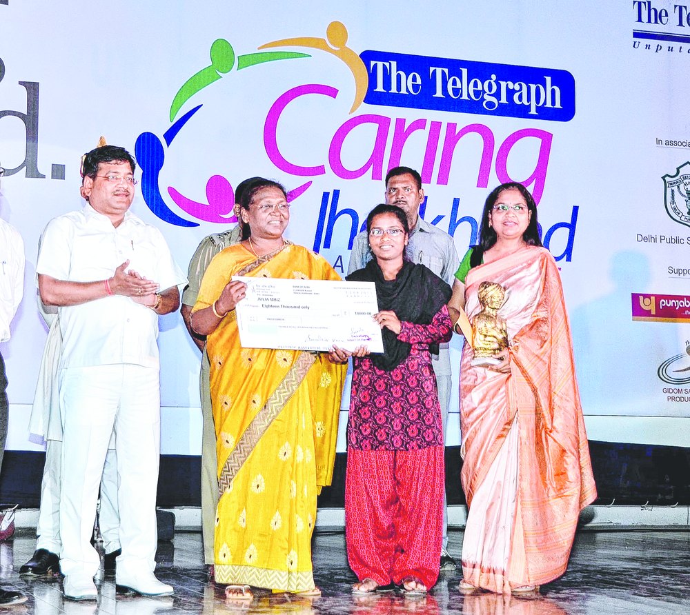 Julia, who stood ninth in state intermediate exams in 2014, received a cheque of Rs 18,000 from Nimitt, handed over by governor Murmu at The Telegraph 's Caring Jharkhand event with the theme "Enriching Jharkhand, responsibly", held at the Delhi Public School auditorium.