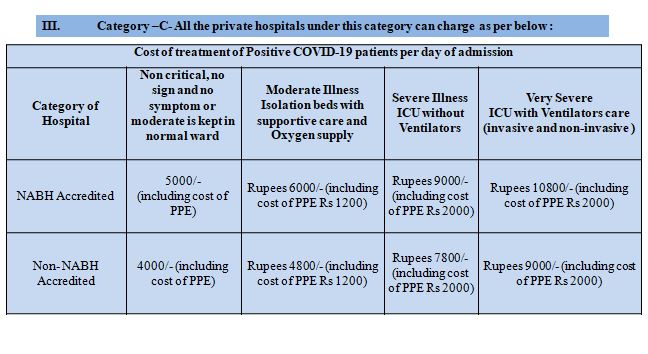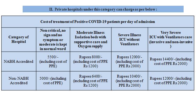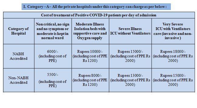 The charges will also vary depending on whether a private hospital is accredited under the National Accreditation Board for Hospitals (NABH) or not. The upper limit for a non-NABH hospital in category A districts has been set at Rs 15,000 per day. The limit is Rs12,000 in category B districts and Rs 9,000 in category C districts for non-NABH hospitals.