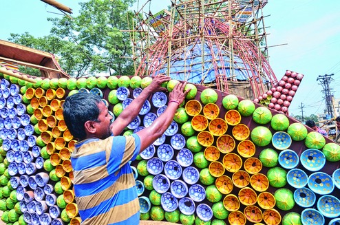 A worker puts up coconut shells at the pandal of RR Sporting Club in Ranchi on Thursday. Picture by Prashant Mitra