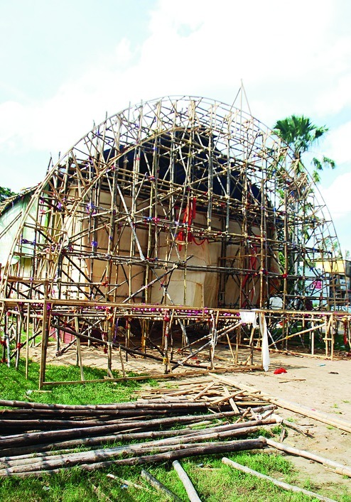 The under-construction pandal of Bengali Welfare Society in Hirapur, Dhanbad, on Thursday. (Gautam Dey)