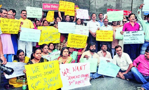 Ranchi, June 24: Over 100 men and women sat on a dharna with placards outside Ranchi railway station today, demanding reinstatement of the Ranchi-Jaynagar Express, the only train which connects the state capital with various towns of Mithilanchal region if neighbouring Bihar.