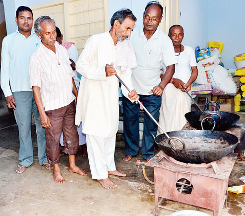 | Kameshwar Pandey with others at Durgabati, Ranchi, on Tuesday. Like his forefathers, he is gearing up to prepare the dry bhog from Saptami. Picture by Prashant Mitra |
