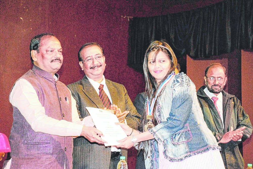 Chief minister Raghubar Das hands over a certificate to Anushka Priya during the function in Ranchi on Thursday. Picture by Hardeep Singh