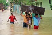 | Residents travel with their belongings to safer places after water from the Kharkai flooded Shastrinagar residential area in Jamshedpur. Picture by Bhola Prasad |