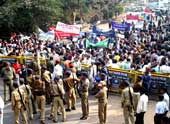 | Police stop a procession of non -teaching staff, demanding the implementation of Central payscale, near Raj Bhavan. Picture by Prashant Mitra |