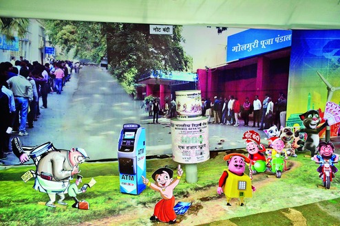 Models to display the virtues of demonetisation at the Golmuri pandal in Jamshedpur on Tuesday. (Bhola Prasad)