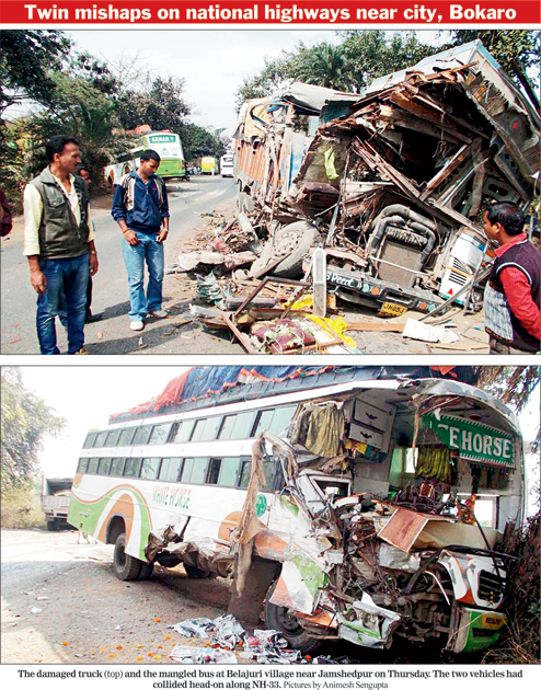The first mishap took place along NH-33, 20km from Jamshedpur, around 5am. A Ranchi-bound coach from Calcutta, whose driver might have been dozing, rammed into a truck coming from Jamshedpur and headed for Ghatshila near a Kali temple at Belajuri village along the highway.