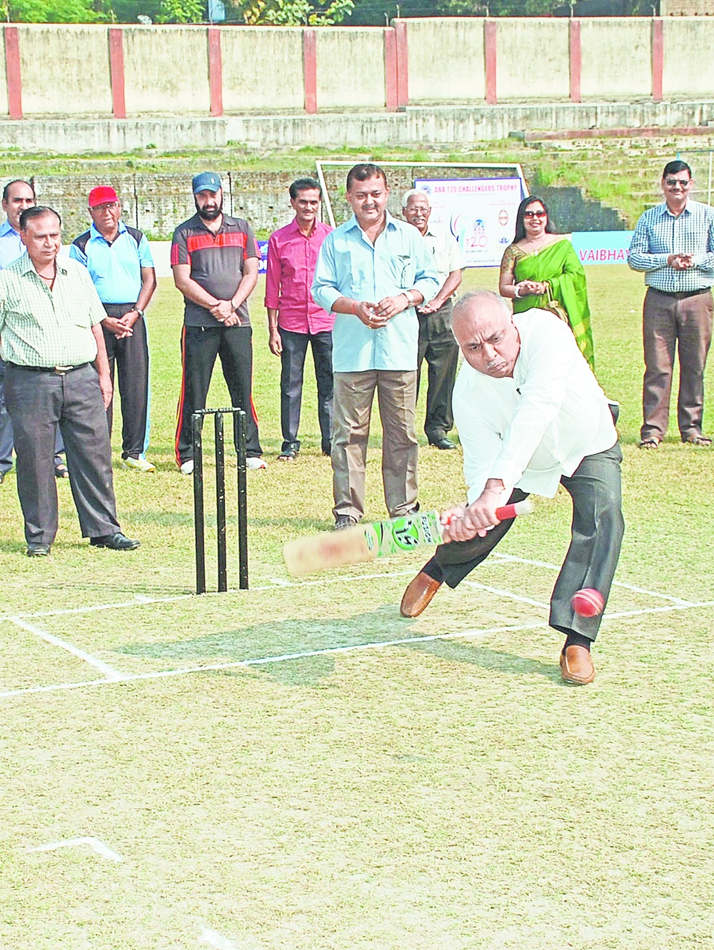 Dhanbad mayor Chandrashekhar Agarwal hits a ball at the inauguration of Dhanabd Builder Association (DBA) T20 Challenger Trophy at Railway Stadium in the town on Wednesday
