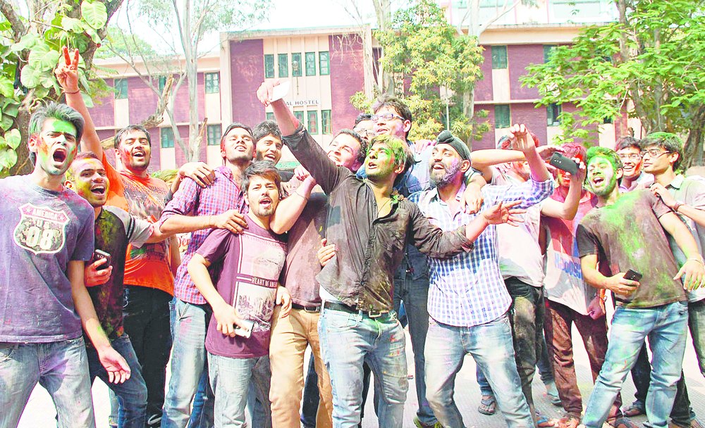 Students of ISM click a group selfie for their celebration album on Dhanbad campus on Saturday. Picture by Gautam Dey