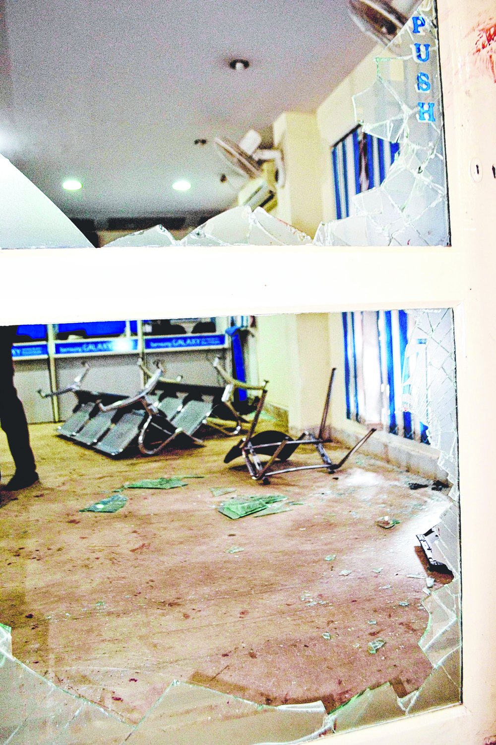 The floor of the service centre was dotted with blood stains, apparently from injuries sustained by the attackers from broken glass.