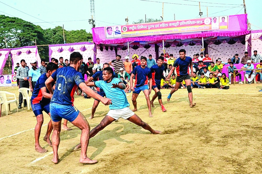 Uttarakhand players (in navy blue) fence their sole Jharkhand rival during a league match on Day Two of the Rashtriya Senior Purush Evam Mahila Kabaddi Pratiyogita-2016 on Mazdoor grounds in Sector IV of Bokaro steel city on Thursday.