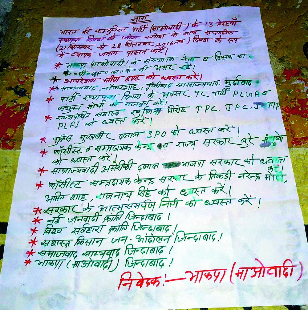 The posters further say that splinter groups like TPC, PLFI, JJMP and JPC were armed criminal gangs enjoying police patronage and they needed to be taught lesson. The Maoists vowed to eliminate special police officers in the villages.