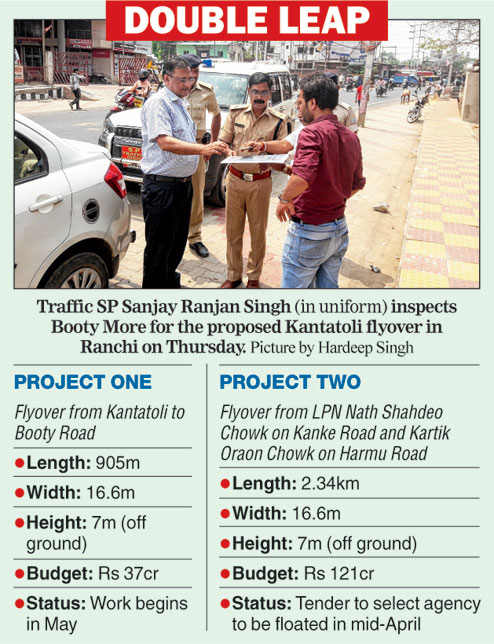 The 905-metre Kantatoli to Booty Road flyover will be constructed at an estimated cost of Rs 37 crore while the 2.34km flyover between LPN Nath Shahdeo Chowk on Kanke Road and Kartik Oraon Chowk on Harmu Road will involve Rs 121 crore. Both flyovers will be 16.6 metres wide and rise 7 metres above ground. Below roads and footpaths will be constructed for which separate tenders will be floated.