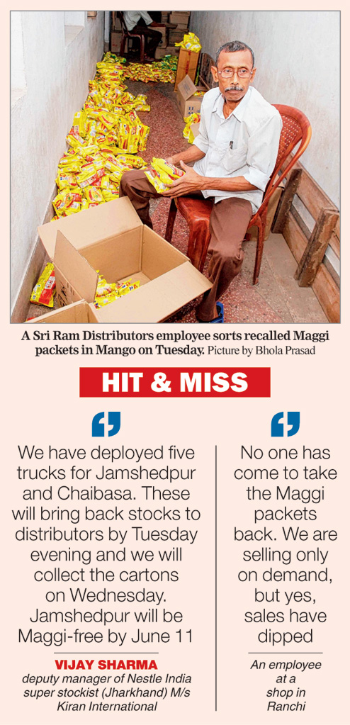 According to the common countrywide communiqué, the company has asked distributors to immediately stop sale of the noodles and recall all packets from shops and store them separately. These stocks would be taken back by Nestle and destroyed at a unit outside the state. While Ranchi and Hazaribagh are going slo-mo on the drive, Jamshedpur, Dhanbad and Bokaro are prompter.