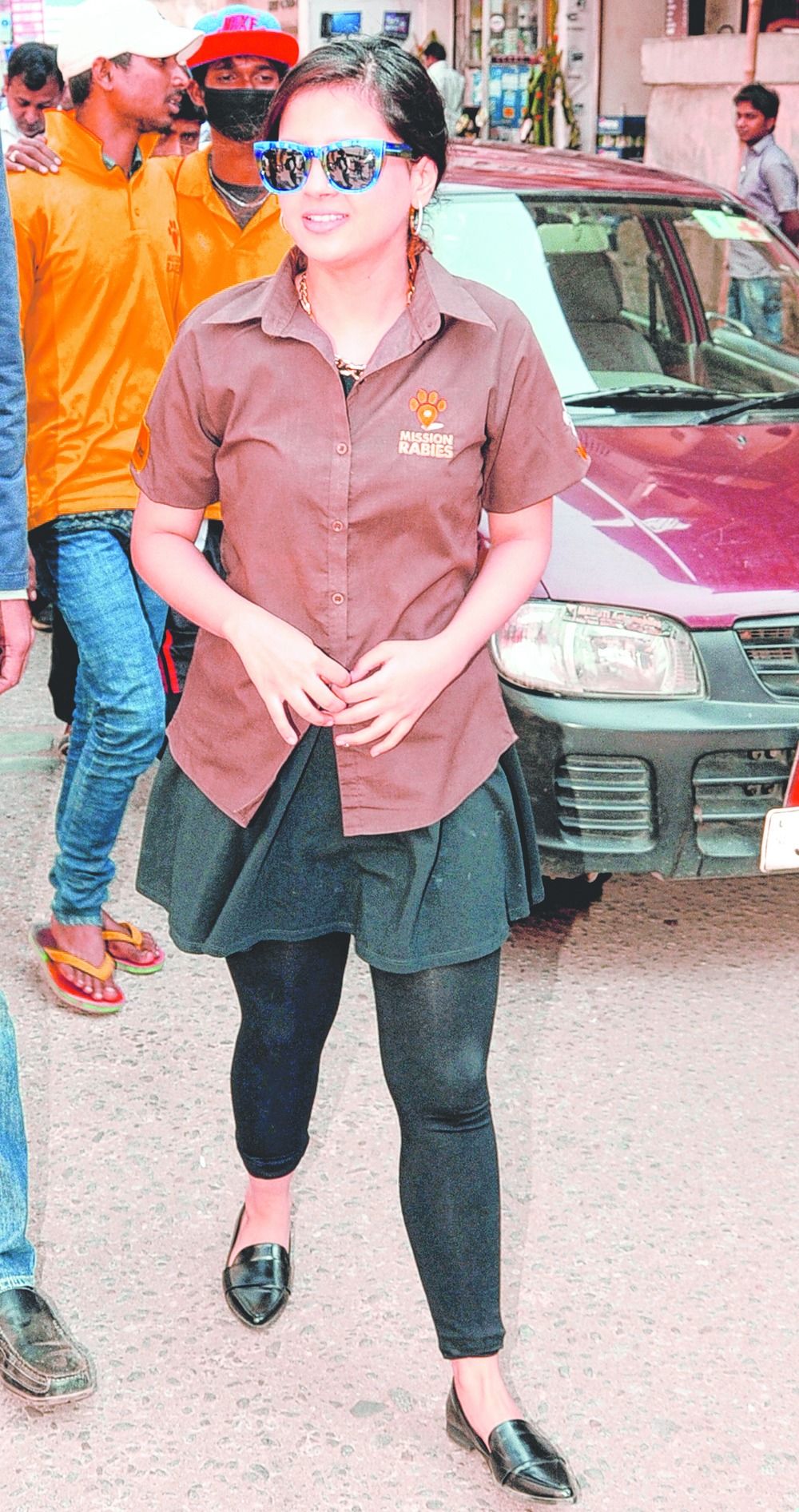 Sakshi Dhoni, an animal rights activist and better half of Team India skipper MS Dhoni, at an anti-rabies campaign at Sujata Chowk in Ranchi on Friday. Mrs D was selected as the brand ambassador of Mission Rabies last year with an eradication target of 2017. Ranchi has an estimated canine population of 26,994. The campaign, organised by the state animal husbandry department and voluntary outfit HOPE and Animal Trust, vaccinated 21,000 dogs and sterilised another 9,681 till October 31. Picture by Prashant Mitra