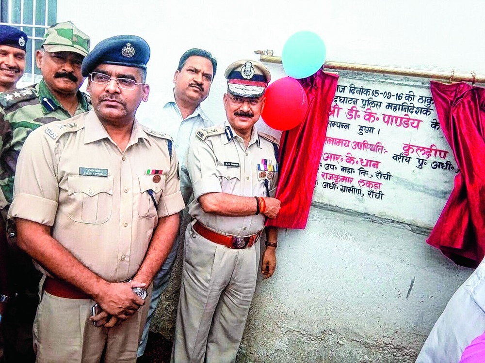 State director-general of police (DGP) DK Pandey (right) inaugurates Thakurgaon thana, the 43rd police station of Ranchi district, in the presence of SSP Kuldeep Dwivedi and other officers on Monday.