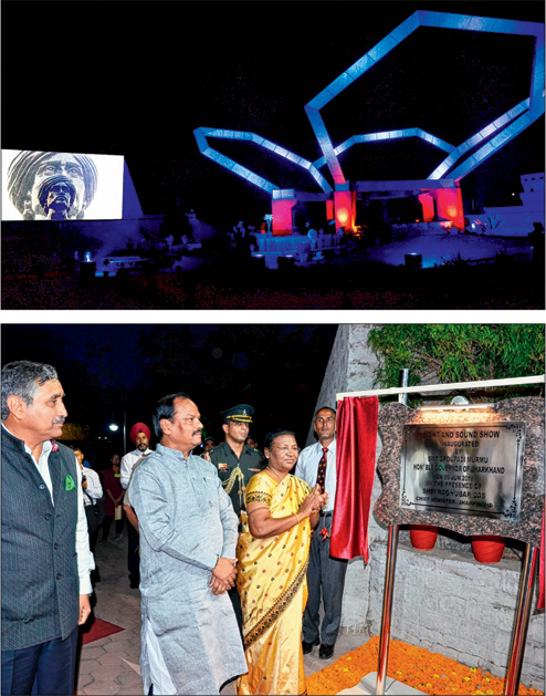 Governor Droupadi Murmu, accompanied by chief minister Raghubar Das and GOC 23 infantry division Rajiv Edwards (above), inaugurates the son et lumière (top) at Jharkhand War Memorial in Ranchi on Tuesday.